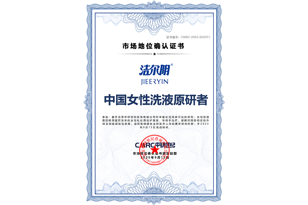 市场地位证明丨洁尔阴-中国女性洗液原研者市场地位证明证书