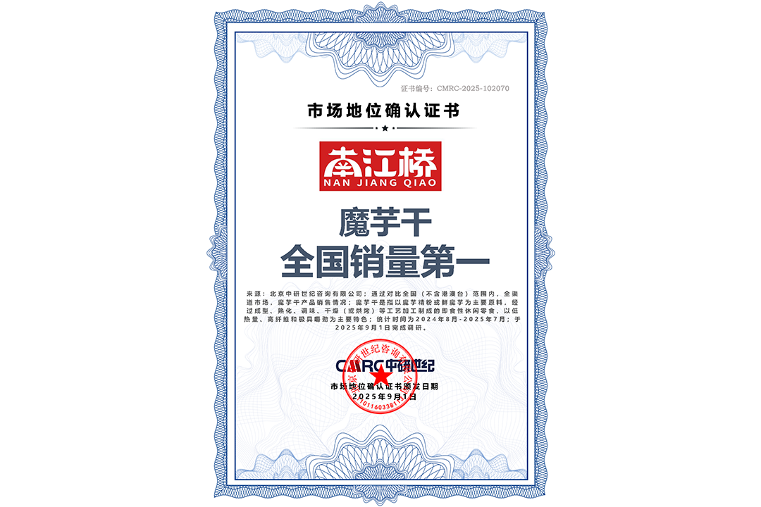 市场地位证明丨南江桥-魔芋干全国销量第一市场地位证明证书