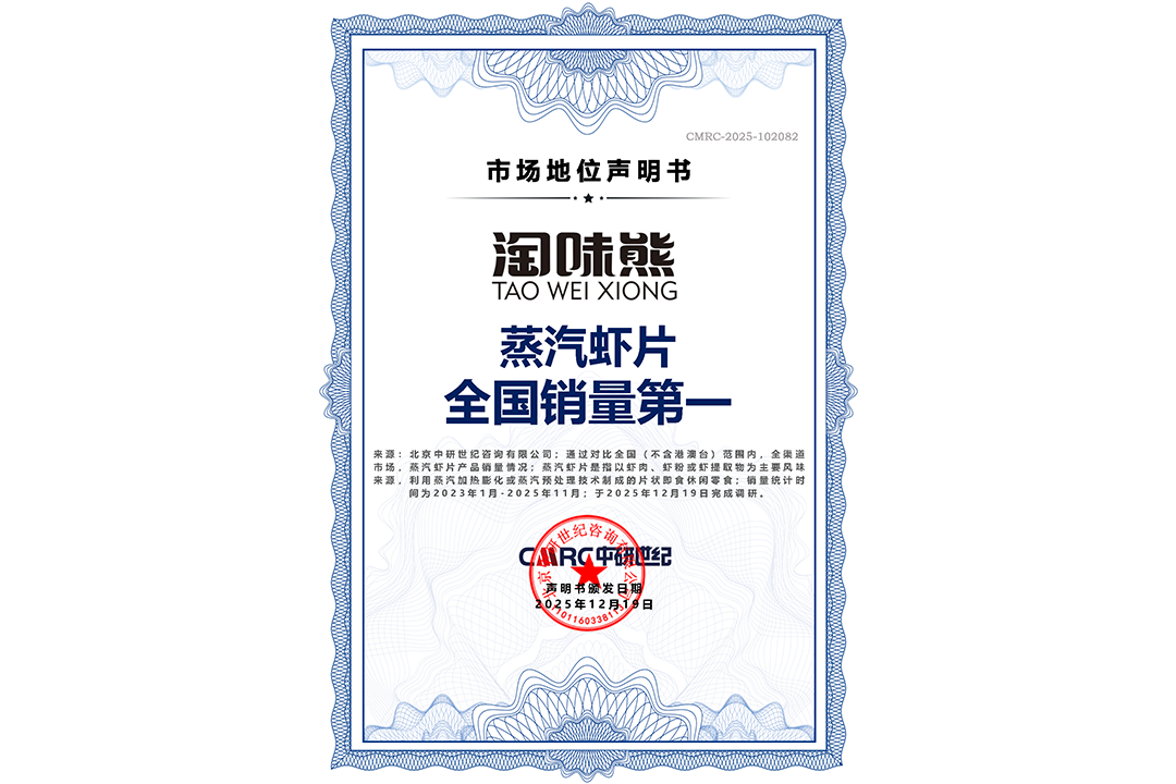 市场地位证明丨淘味熊-蒸汽虾片全国销量第一市场地位声明证书