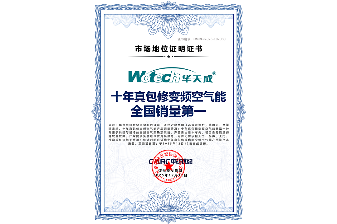 市场地位证明丨华天成-十年真包修变频空气能全国销量第一市场地位证明证书
