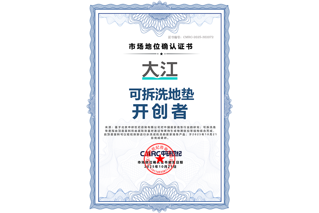 市场地位证明丨大江-可拆洗地垫开创者地位证明证书