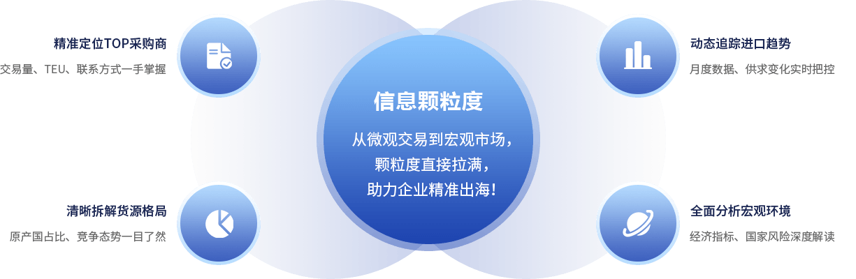 中研世纪深耕海外市场研究,精准覆盖采购商全景数据「交易规模 / 频次 / 企业详情」、货源国竞争格局「原产国占比 / 供应趋势」、